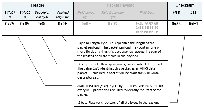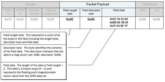 Below is an example of a packet payload with two fields (gyro vector and mag vector). Note the payload length byte of 0x1C which is the sum of the two field length bytes 0x0E + 0x0E:
