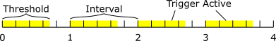 In interval mode, the last two parameters are threshold and interval as doubles. The trigger is active when the data value, modulo the interval, is less than the threshold. This forms a repeating pattern which is useful mostly for time quantities.