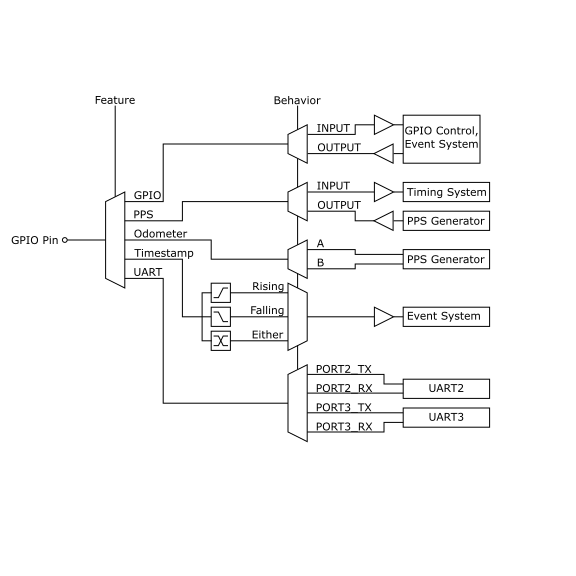 The GPIO can be used with the Event System for various purposes, such as time synchronization. See Action: GPIO and Trigger: GPIO for more details. When using the GPIO Trigger in edge mode, the GPIO feature should be set to the TIMESTAMP feature. Otherwise, set it to the GPIO feature for use with the event system.