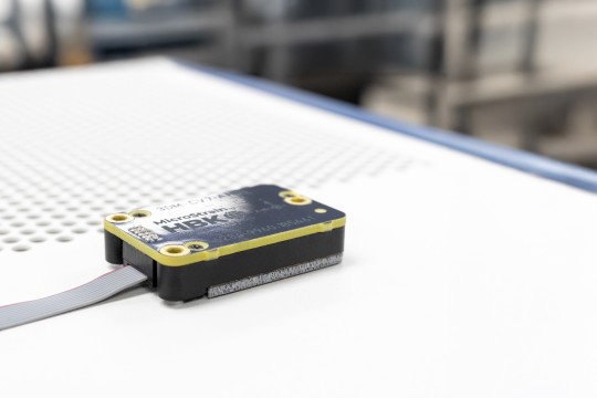 Attach the ribbon cable to the CV7 before moving forward. Once the CV7 is mounted down, it is difficult to remove it. Make sure the ribbon cable is pressed up against the header. Peel off the next layer of adhesive backing and place the CV7 down as shown.
