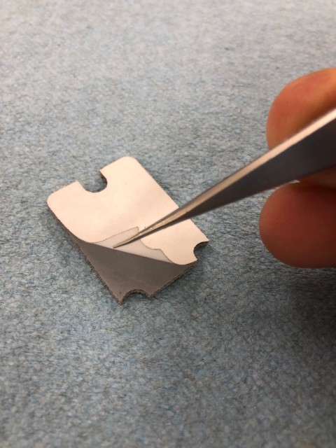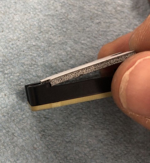 Place the adhesive side of the foam with the removed backing onto the bottom of the CV7 by locating it using the edges of the two mounts, as shown.