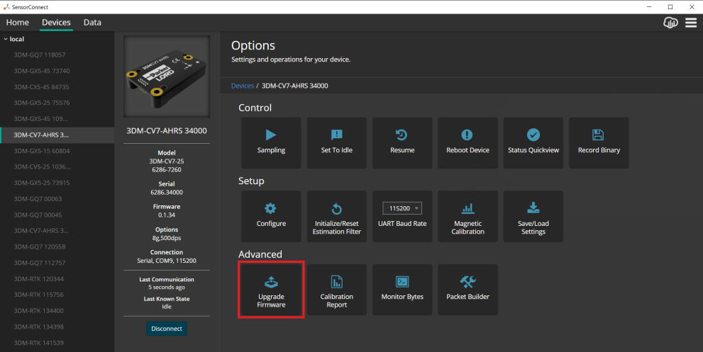 Firmware upgrades for the 3DM-CV7 will periodically be available through the product web page. For a simple Windows GUI - desktop option for applying firmware upgrades, SensorConnectâ„¢ (see Software) provides an easy to user interface for the 3DM-CV7. For an embedded command line interface for Linux, or Windows, Inertial Upgrader CLI provides an executable that can be run directly from the command line.