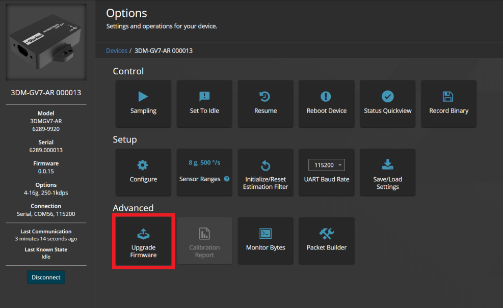 Once SensorConnectâ„¢ is open and connected to the device, select the "Upgrade Firmware" tile.